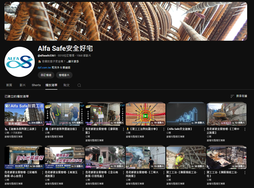 建案業主可隨時隨地由YouTube網路平台觀看各階段認證工作之流程、品質細節、施工品質之控管,可符合建案業主掌握建案施工品質透明化呈現之資訊。其內容包括「Alfa Safe安全好宅」之教育訓練服務、鋼筋施工品質查驗、「Alfa Safe耐震系統工法」施工品質觀摩會...等等,皆製做成影片上傳至「Alfa Safe安全好宅」YouTube頻道,對外透明化系統鋼筋工法執行過程記錄。